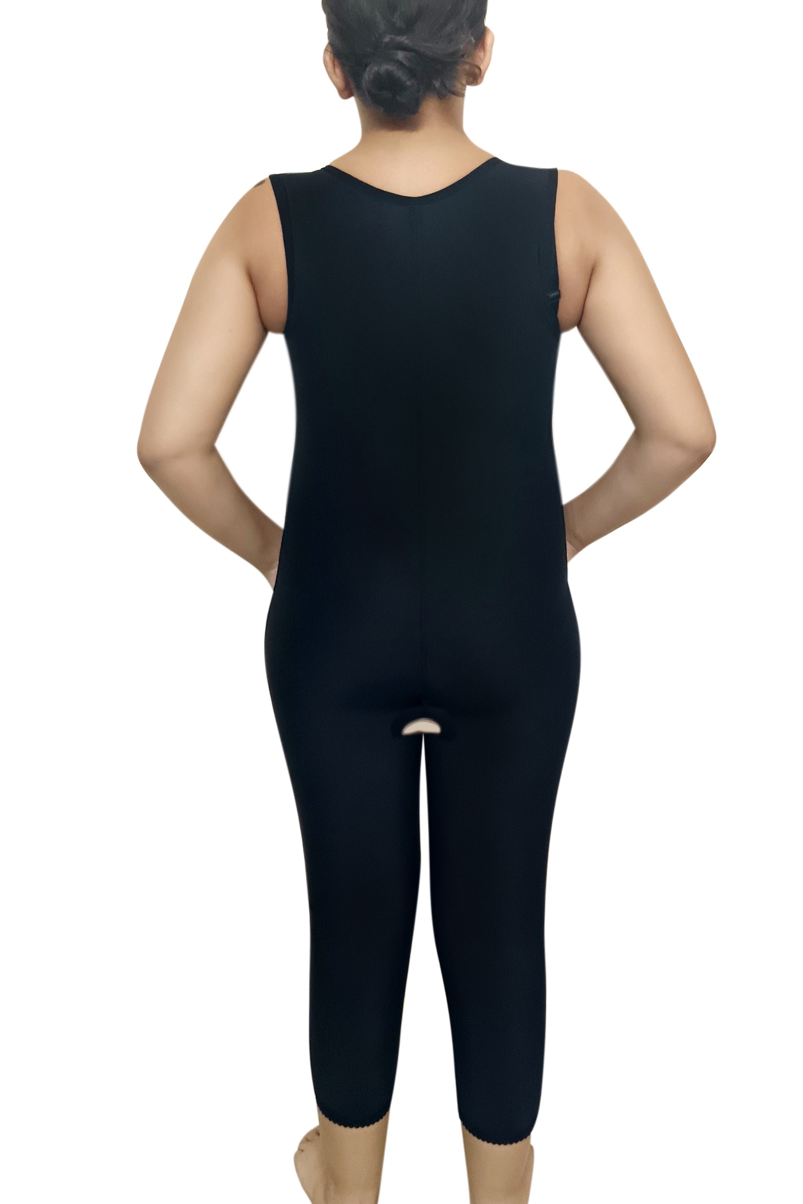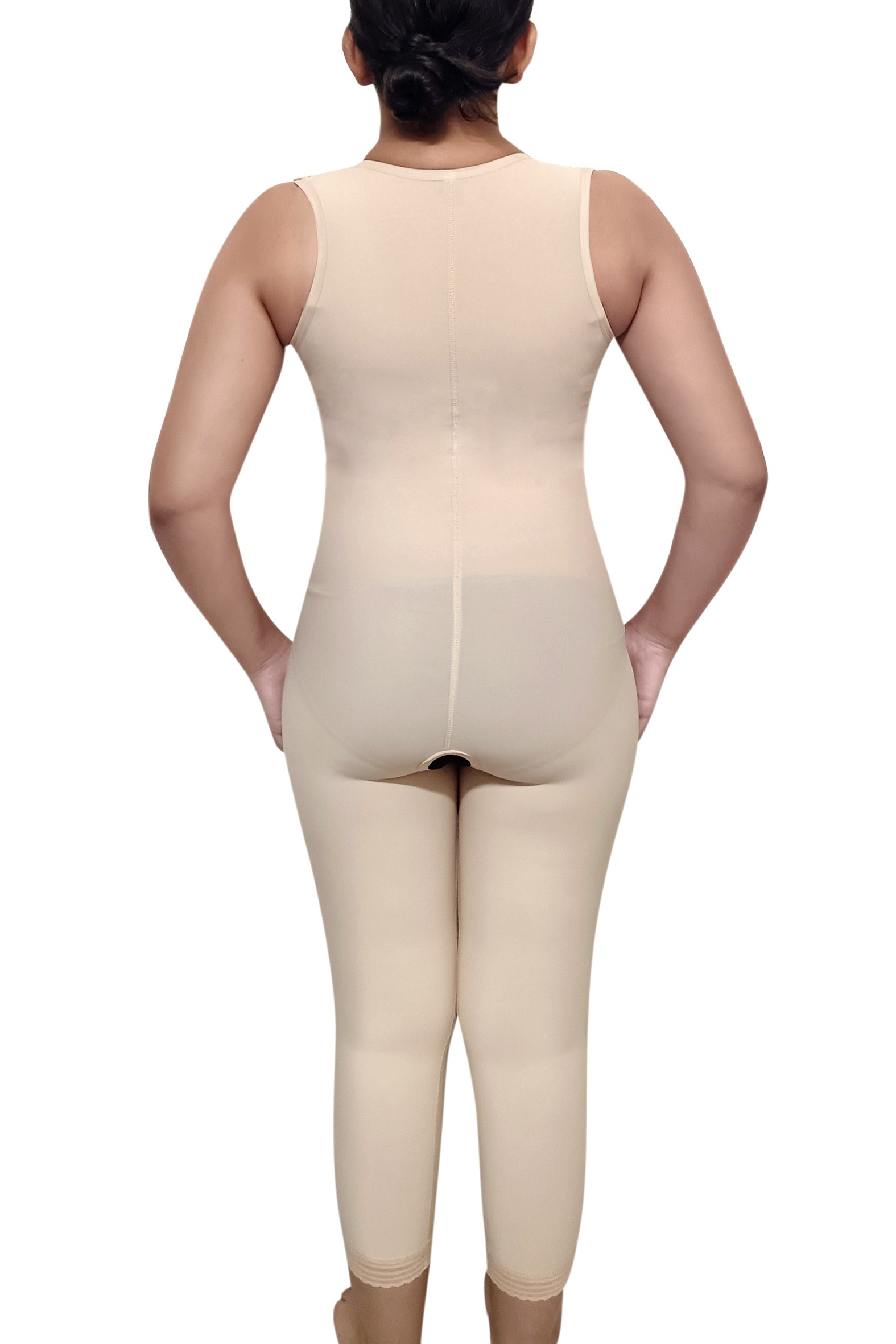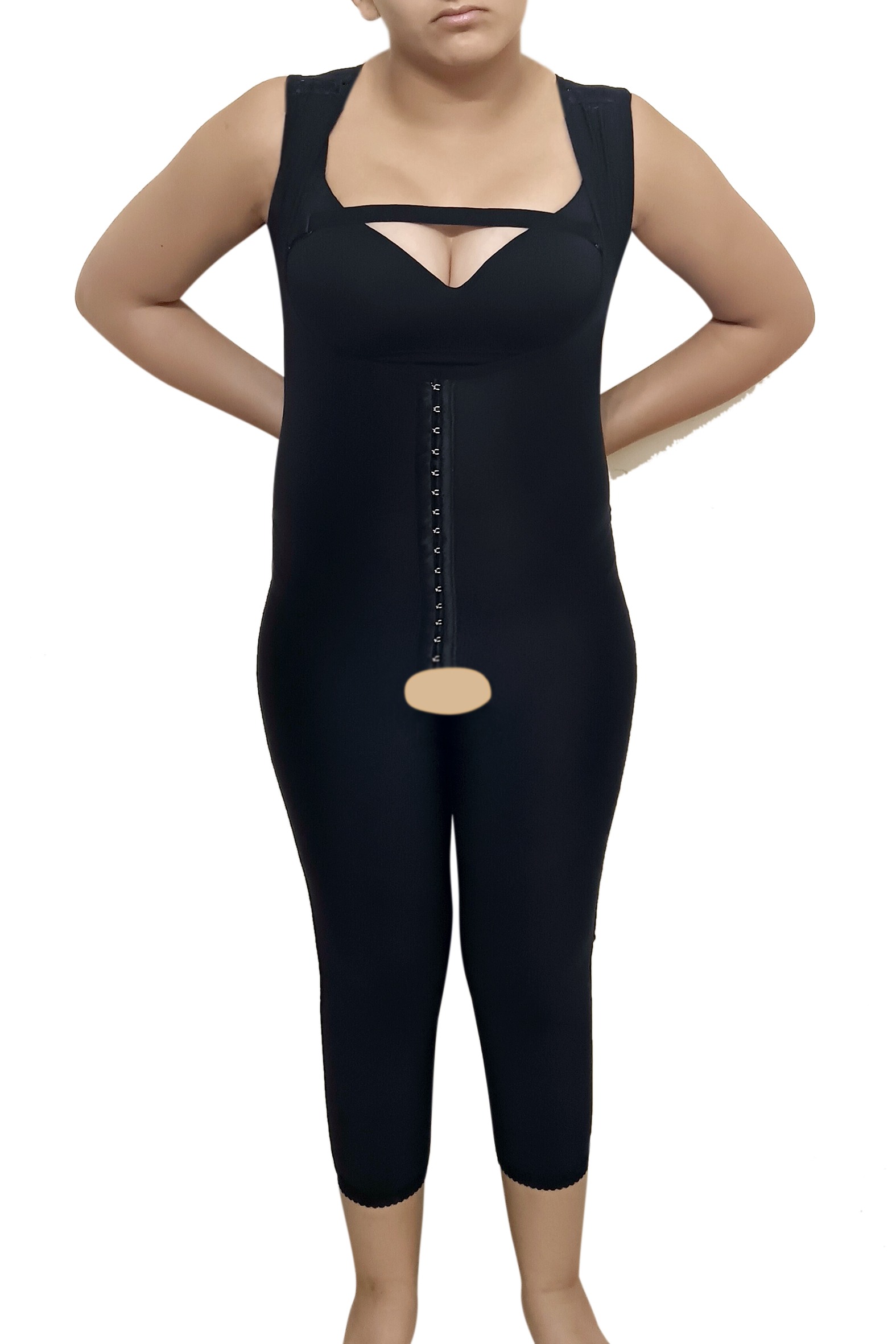 Compression Garment with frontal close with 3 rows of hook and eye for multiple option of compression & easy opening, High waist, under bust, High back, Below knee to Ankle, Bottom Opening , Designed for convenience and comfort, The adjustable Wide shoulder of Hook and Eye for multiple option of compression & easy opening.